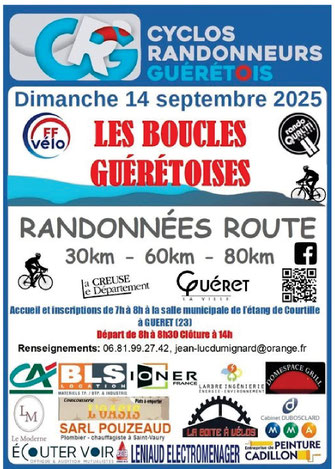 Notre Club organise ce dimanche 14 septembre 2025, la traditionnelle randonnée cyclotouriste " Les Boucles Guérétoises".